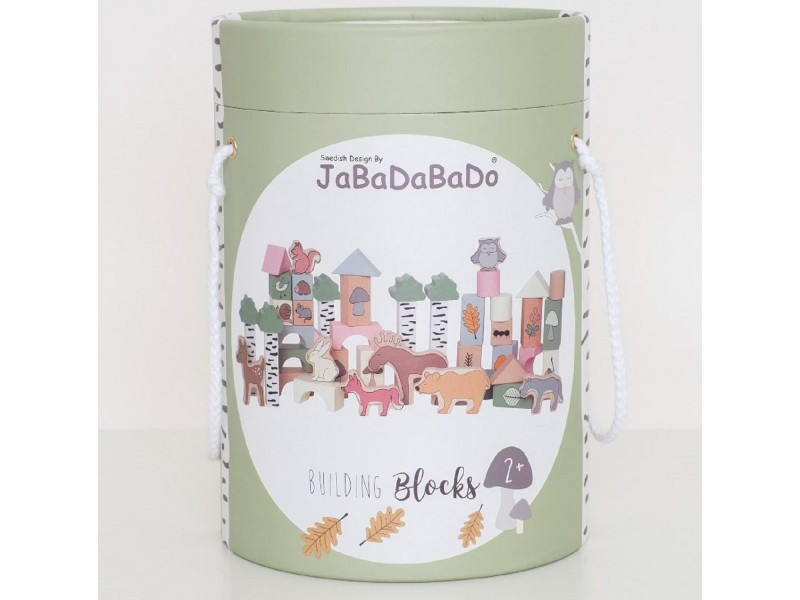 Építőkészlet 50 különböző színű és formájú fakockával, valamint állatfigurákkal.