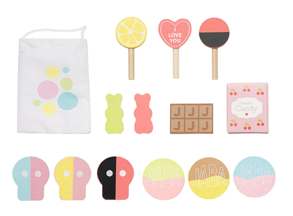 A szép színekkel kialakított édességek fából készültek és népszerű finomságokat jelenítenek meg.