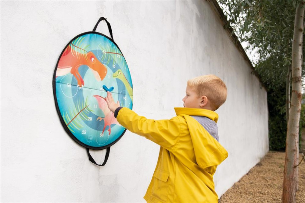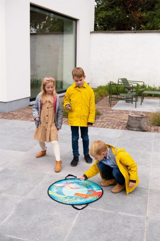 Nagyon kedves figurákkal mintázott célbadobó játék, amely izgalmas játékélményt kínál, miközben fejleszti a kicsik mozgását. A játék a falra akasztva de a földre kiterítve is használható.