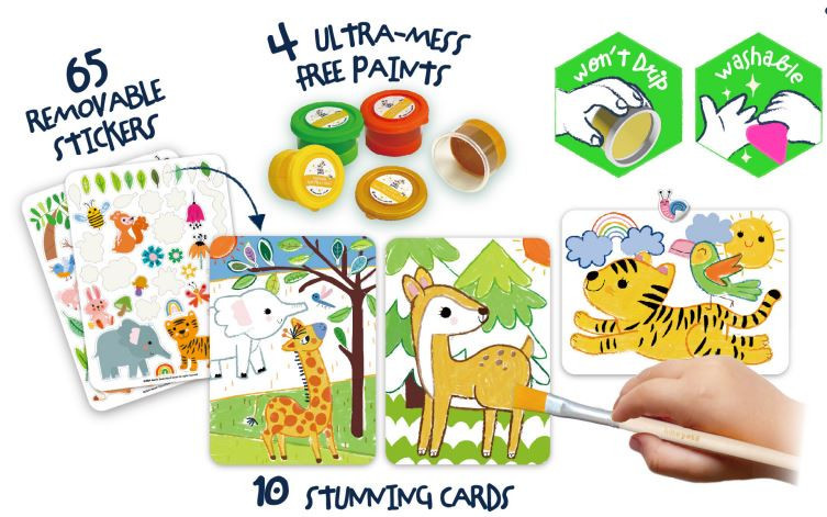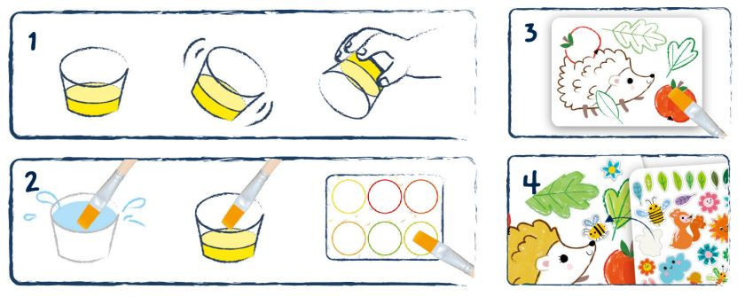 A készletben 4 db festék (nem folyank ki a tégelyből), 10 db kifesthető kártya, 65 db újrapozícionálható matrica, 2 db ecset (különböző vastagságúak) és 1 vízes tégely található.