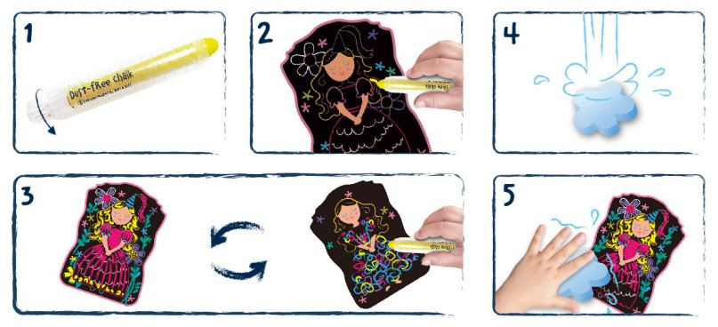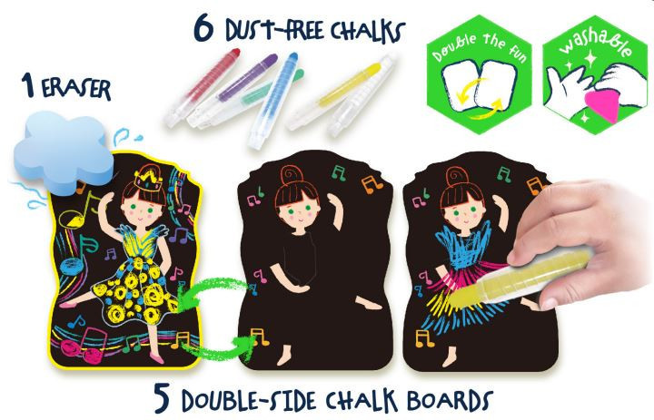 A készletben 5 db kétoldalas krétatábla kártya, 6 db pormentes kréta (kicsavarható) valamint 1 radír található.