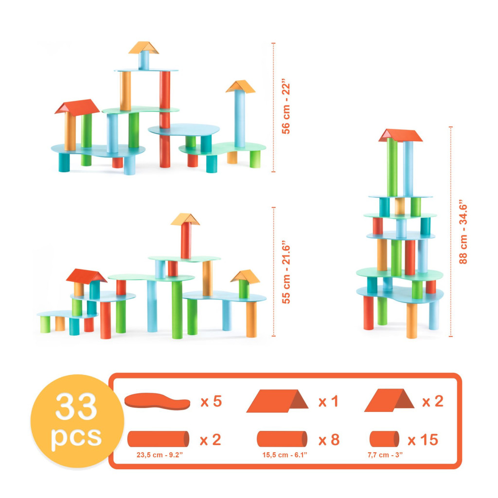 Csak kartoncső és kartonlemez, mégis a végtelen lehetőségek építőjátéka. 37 db alapszínekben pompázó építőelemet tartalmaz. A csövek, azaz hengerek, és az összekötő elemek 3 féle méretben vannak a készletben. Ez a szín és méretbeli különbség lehetőséget ad a nagyság, magasság, hosszúság és terület összehasonlítására. A gyermek játék közben tapasztalja meg a mennyiségek azonosságát és különbségét. A cselekvő gondolkodás eszköze ez a végtelenül egyszerű, de nagyszerű építőjáték!