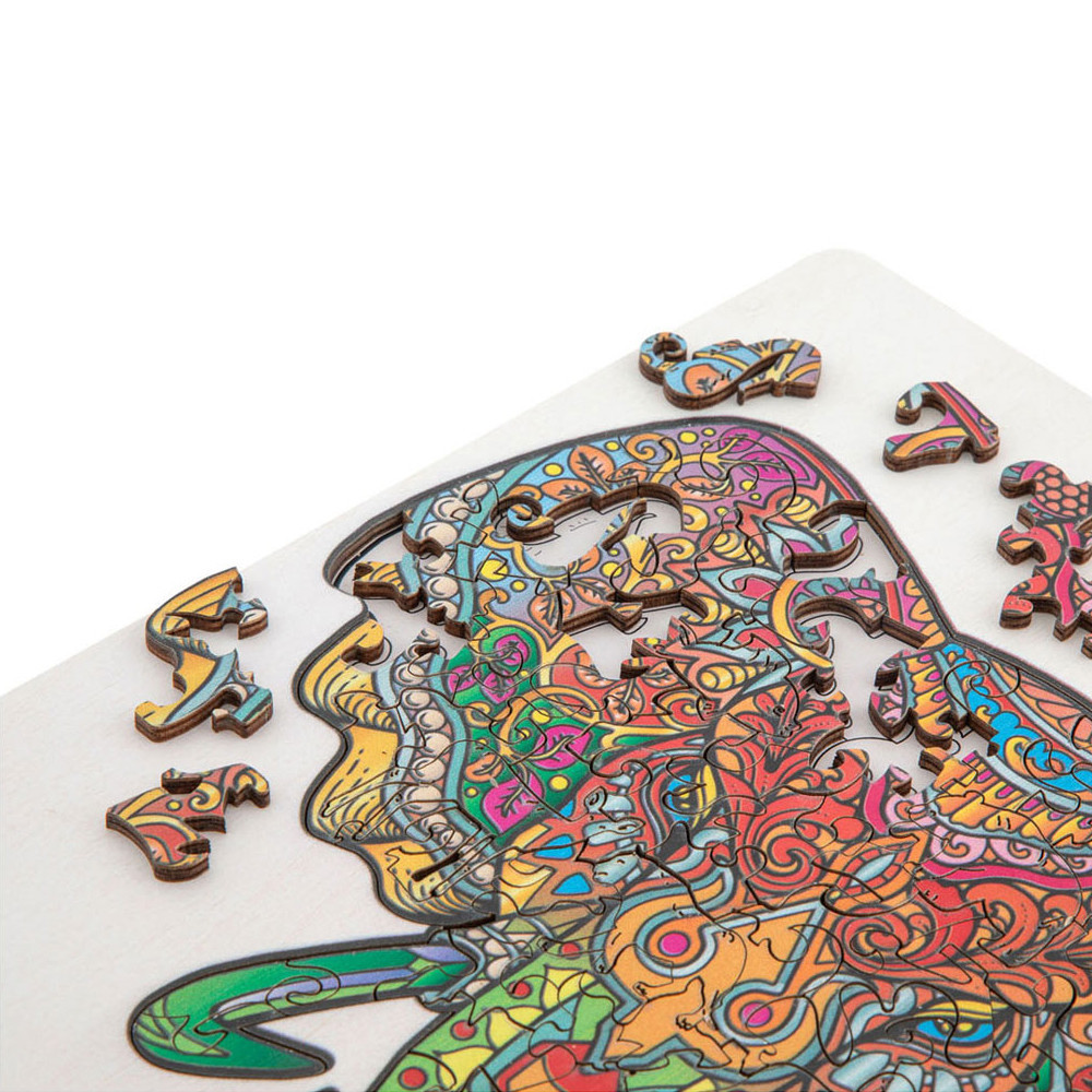 Fából készült mozaik kirakó állvánnyal, elefántos dizájnnal. A kirakó 132 egyedi formájú darabból áll, és a mellékelt fa állványra szépen kihelyezhető az összeillesztést követően.