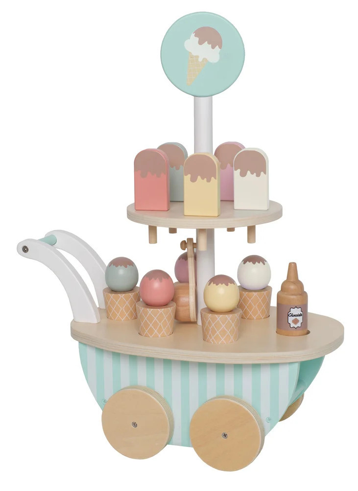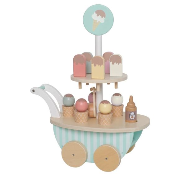 Gyönyörű fagylaltkocsinkon keresztül végre megnyithatod a saját fagylalt bárodat! Az asztalka méretű fagylaltkocsi kerekekkel rendelkezik, így akár tologathatod is. Az aranyos állványon 5 fagylalttölcsér található 5 jégkrémmel, egy fagylaltkanállal és egy csoki öntettel. A fagylaltkészlet a kis méretű kezek számára tökéletes, ösztönzi a kreativitást, a képzeletet és a szerepjátékot.