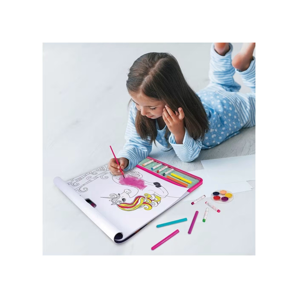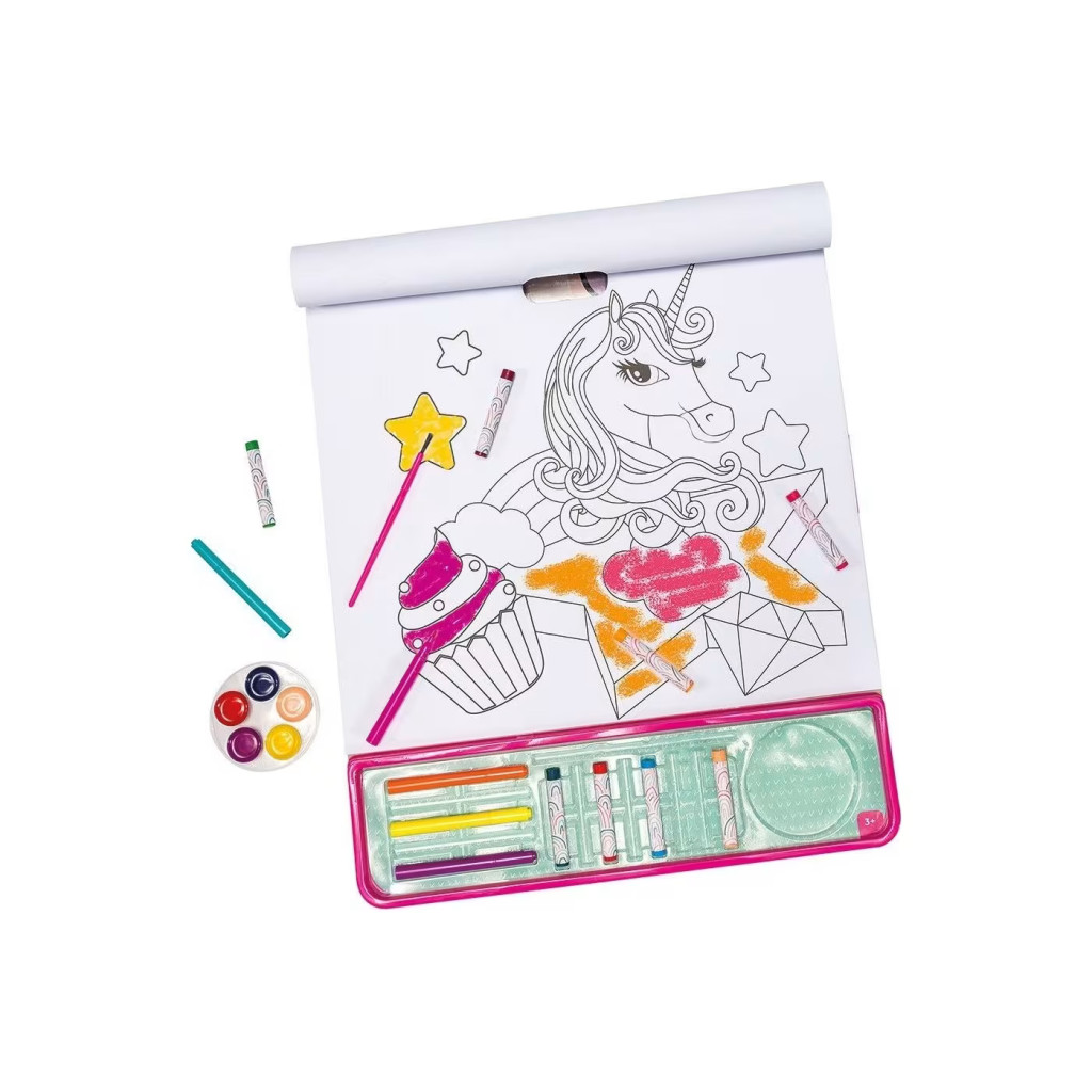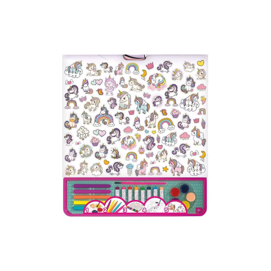 Giga méretű unikornisos kreatív készlet . Tartalma: 5 db filctoll, 5 színű festék, ecset, 8 db zsírkréta, matricák, kiszínezhető lapok. Mérete: 42 x 35 x 2cm