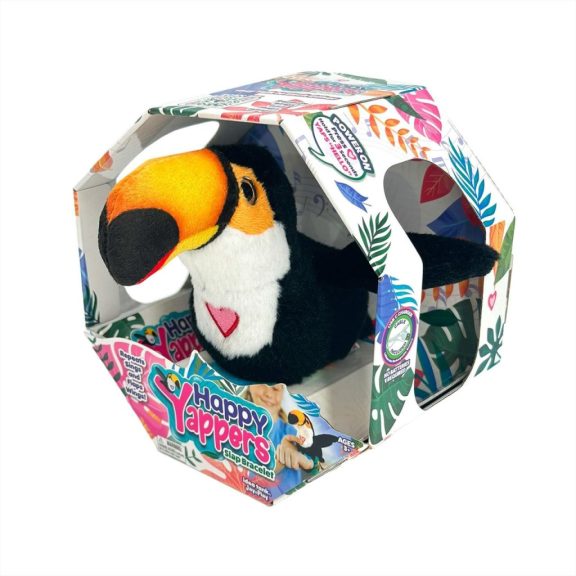 A Happy Yappers interaktív plüss madarakat a pánt segítségével könnyen a csuklódra ülnek. Csak nyomd meg a szívecskét a mellkasukon, és máris indulhat a közös játék! Ezek a madarak csiripelnek, énekelnek, beszélnek hozzád, és akár meg is ismétlik, amit mondasz. Ez a verzió egy szép tukán madár.