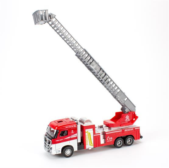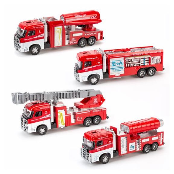 Hátra húzható fém tűzoltó játékautók többféle kivitelezésben (létrás, emelő kosaras és két féle turbo jet). Az extra játék élményről ráadásul fény és hang effektek is gondoskodnak!
