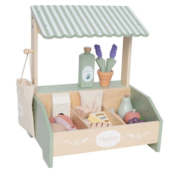 Ez a csodálatos, fából készült piaci stand tökéletes kiegészítő azoknak a gyerekeknek, akik szeretnek boltosat játszani és eladni mindent a friss zöldségektől a házi kenyérig. A készlet az áruk kedves keverékét tartalmazza: kenyér, zöldségek, hús, sajt, tej, olívaolaj és levendula egy cserépben - mindez gyönyörű pasztell színekben. A készlethez tartozik egy kis szövetszatyor is, amibe a vásárlók válogathatnak, vagy amiben magukkal vihetik a megvásárolt termékeket. A gyerekek vígan gyakorolhatják a vásárlást, az eladást és az árképzést. Tökéletes a fantáziadús játékhoz és a szociális és matematikai készségek fejlesztéséhez!