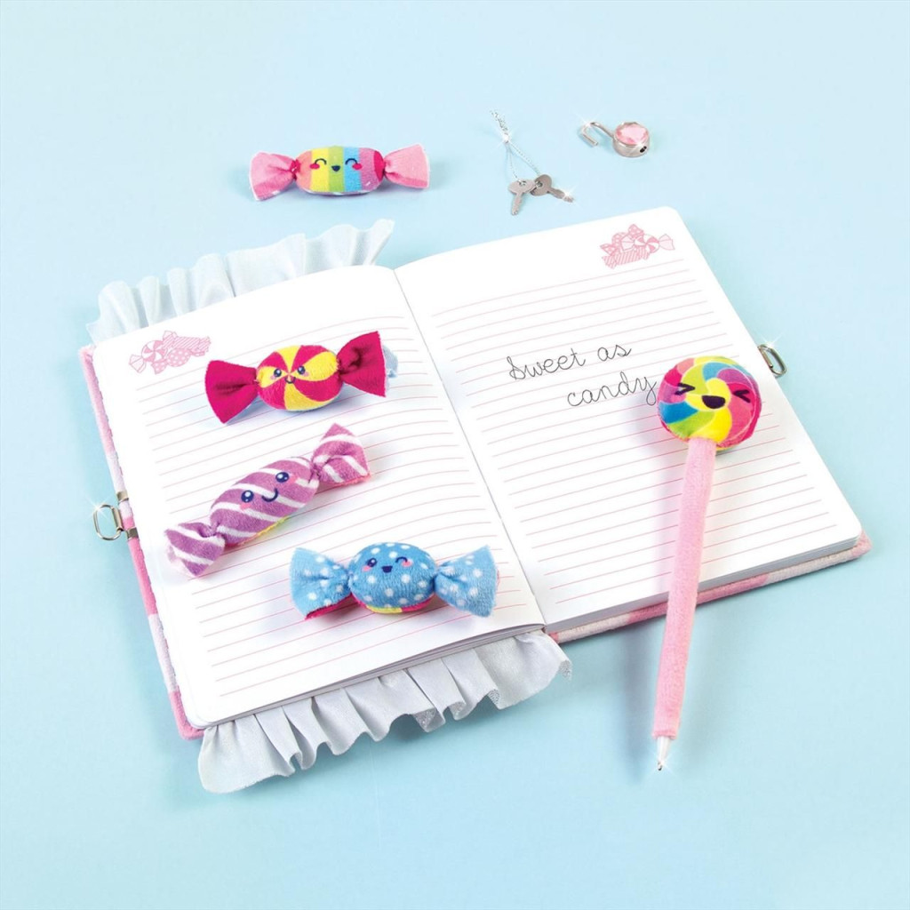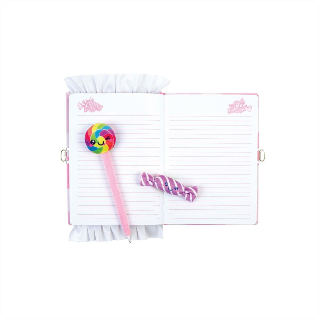 A vonalas notesz cukorka mintás puha plüss borítóval , lakattal zárhatod, hogy megőrizd a papírra vetett gondolataidat. A szett része egy hozzáillő toll is, ami egy bájos nyalóka formában végződik, valamint 4 darab plüss cukorka a szuperédes hangulathoz. 6 éves kortól ajánljuk.