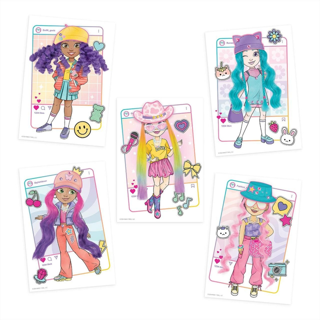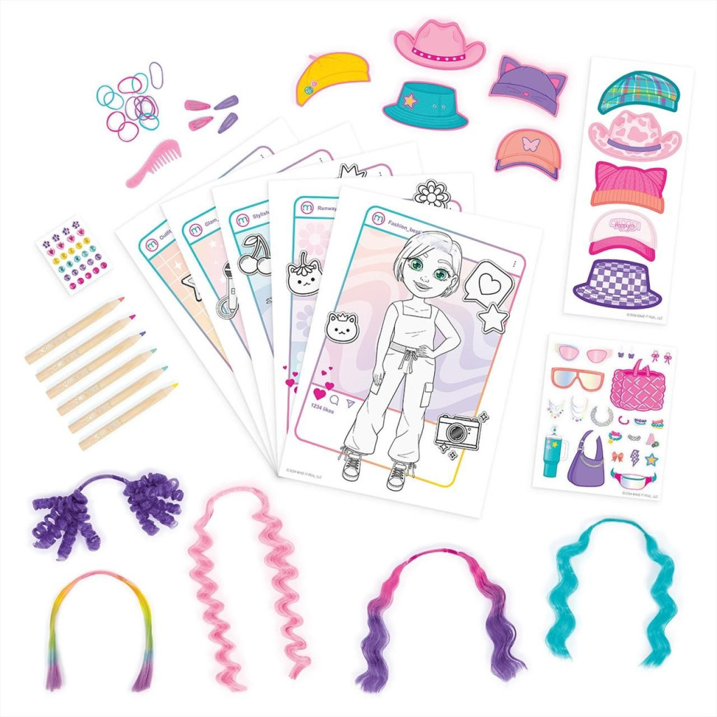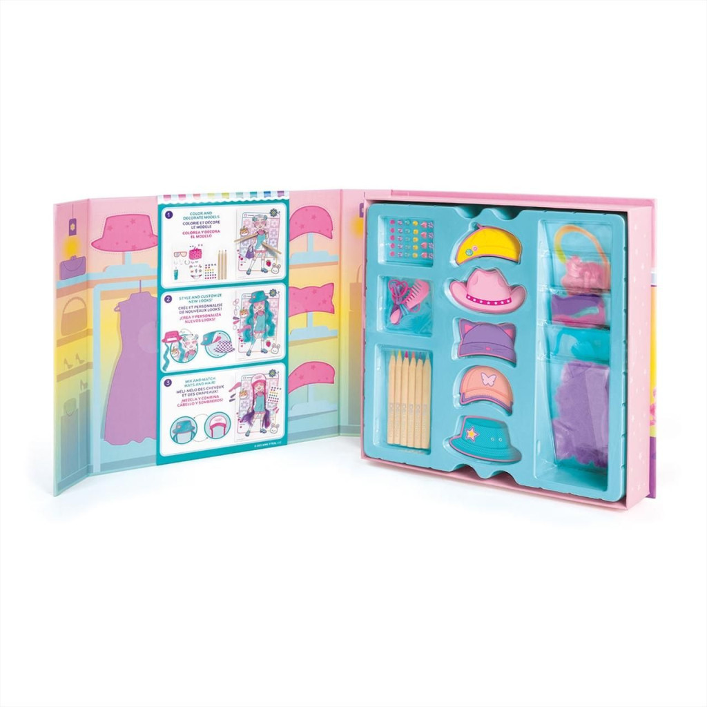A gyerekek 5 különböző modellt díszíthetnek ki – rajzolhatnak, színezhetnek, matricázhatnak, és olyan egyedi szetteket alkothatnak, amelyek akár a kifutóra is kerülhetnének. A cserélhető frizurák és levehető kalapok segítségével a megjelenések variálhatók, így minden alkotás egyedi. A stílusalkotás azonban itt még nem ér véget: a csomag tartalmaz valódi tapintású hajat is, amelyet a mellékelt fésűvel, csatokkal és hajgumik segítségével fonhatnak, csavarhatnak vagy formára igazíthatnak – mintha csak egy miniszalonban dolgoznának a gyerekek.
