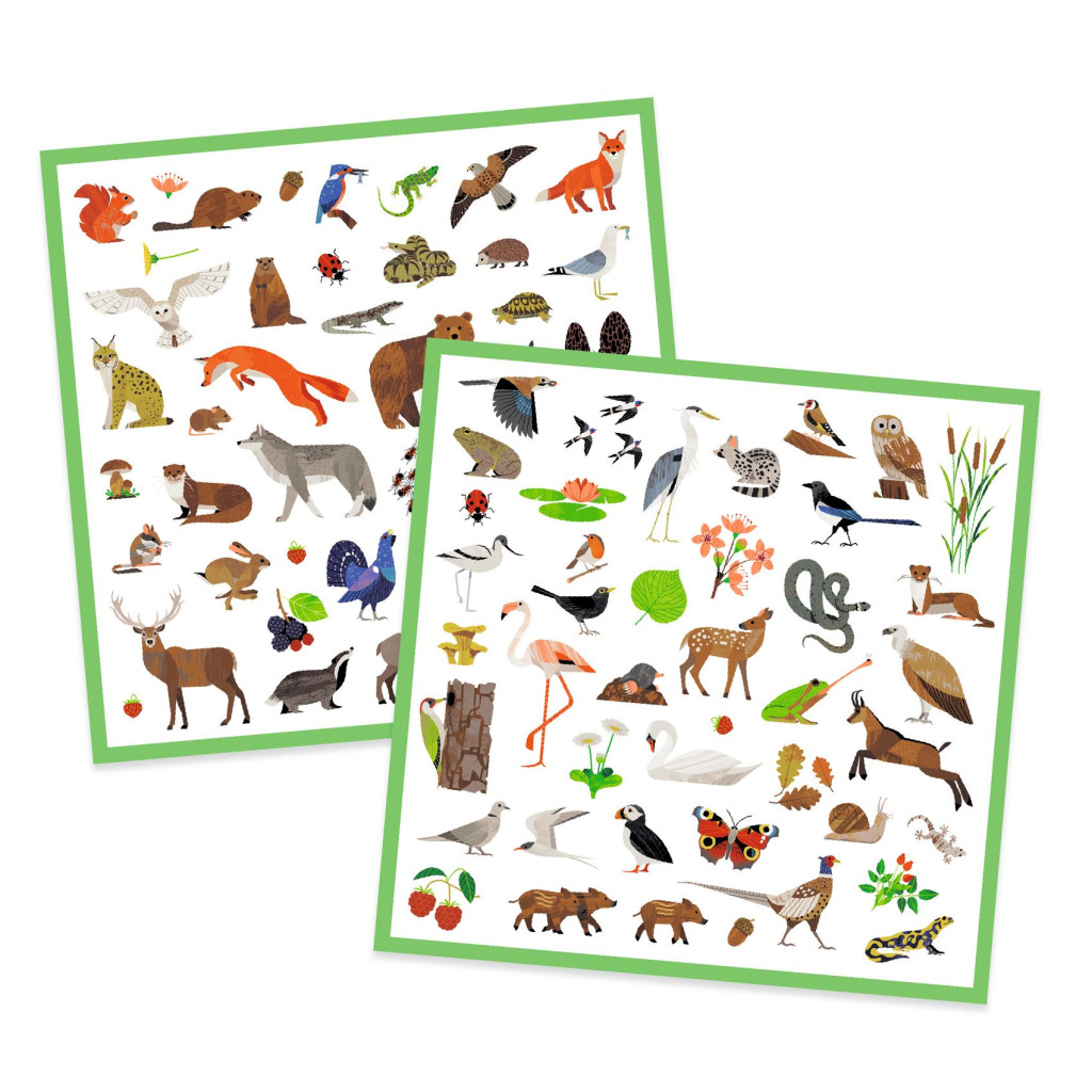 160 európai állat élethű rajza található a matricagyűjteményben. A csíkos vadmalacok, a legyet fogó béka, a verőköltő bodobácsok, a hétpettyes katica és a többiek mind a matricafüzetbe ragaszthatóak, mesekönyv készíthető belőlük vagy akár ajándékok, képeslapok, iskolai füzetek, kedvenc tárgyak díszítésére is felhasználhatóak.