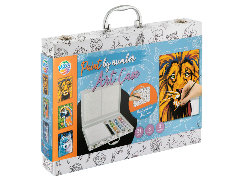 Ez a mesés Festés számok szerint készlet bőröndbe csomagolva 3 előre nyomtatott vásznat (oroszlán, farkas és papagáj), 21 festéket és 3 ecsetet tartalmaz. Kiváló választás az alkotást és festést kedvelő gyermekek számára.