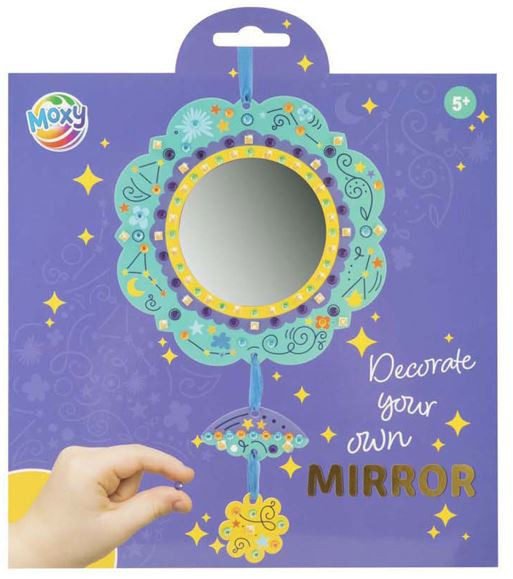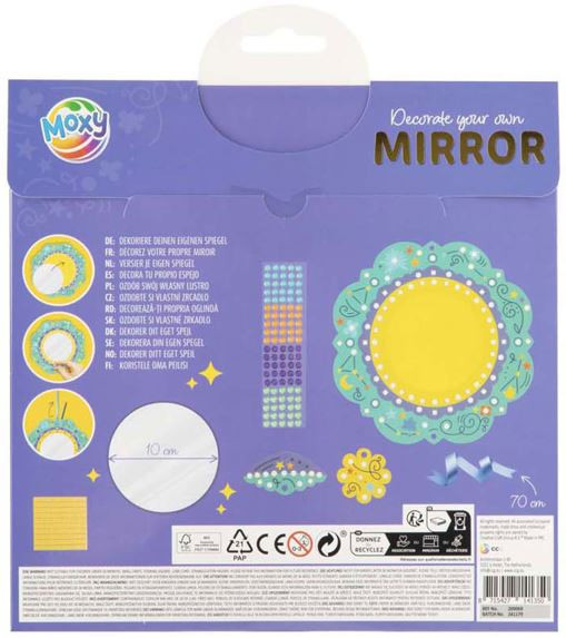 A készletben található egy kidíszíthető karton alap, egy tükör matrica, dekorációs öntapadós strasszkövek és matricák, valamint egy szalag, amivel az egyes részeket egymással összefűzheted és amivel az elkészült munkának akasztót csinálhatsz.