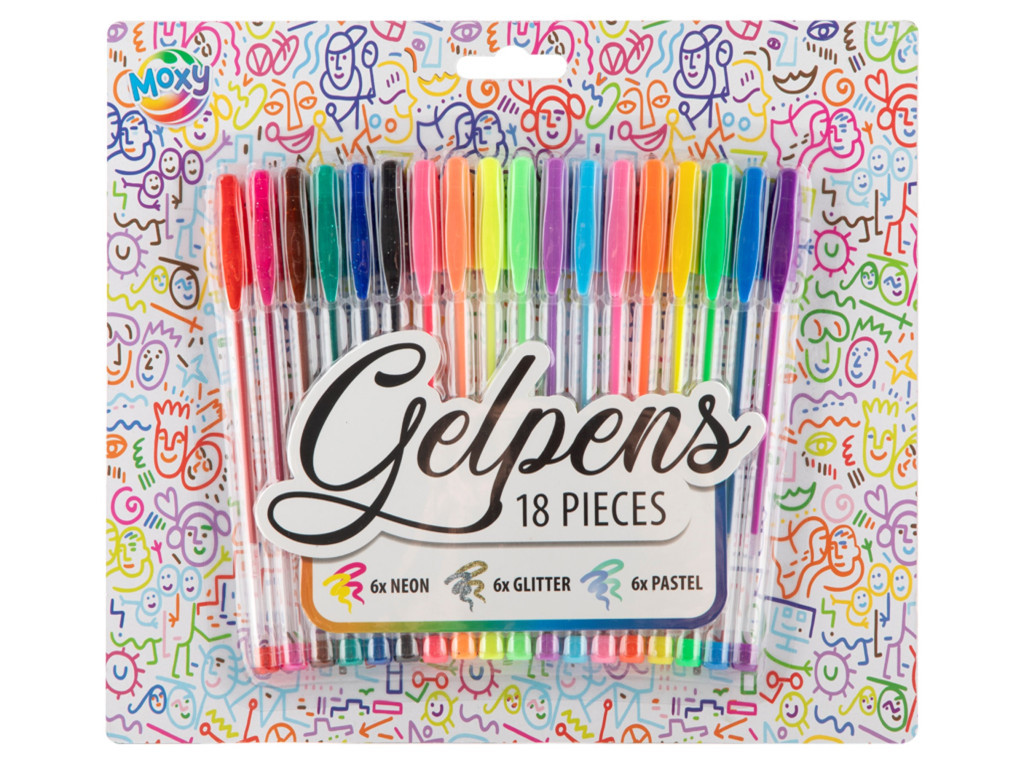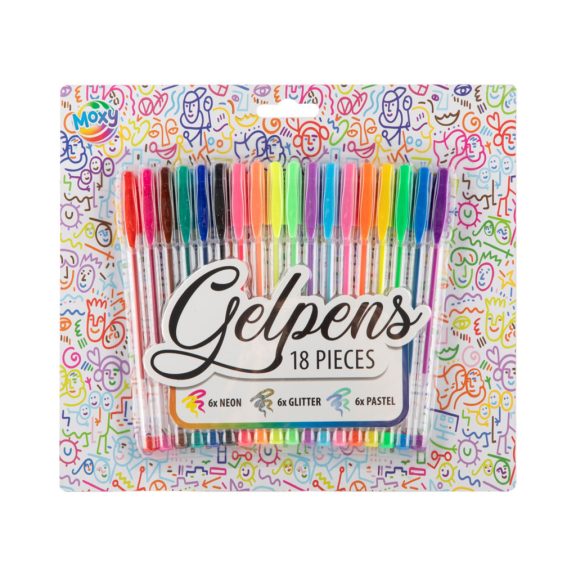 18 db-os színes zseléstoll készlet, melyben neon, csillogós és pasztell színek is megtalálhatók.