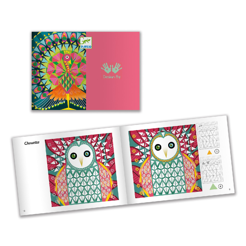 Eredeti mozaikozó tevékenység, amely lehetővé teszi a gyermekek számára, hogy háromszög alakú darabokkal dolgozzanak. A füzetben található utasításokat lépésről lépésre követve a gyermek óvatosan felragasztja a habszivacs alapú színes háromszögeket a táblákra, hogy elkészítse a páva és a bagoly tollazatát.