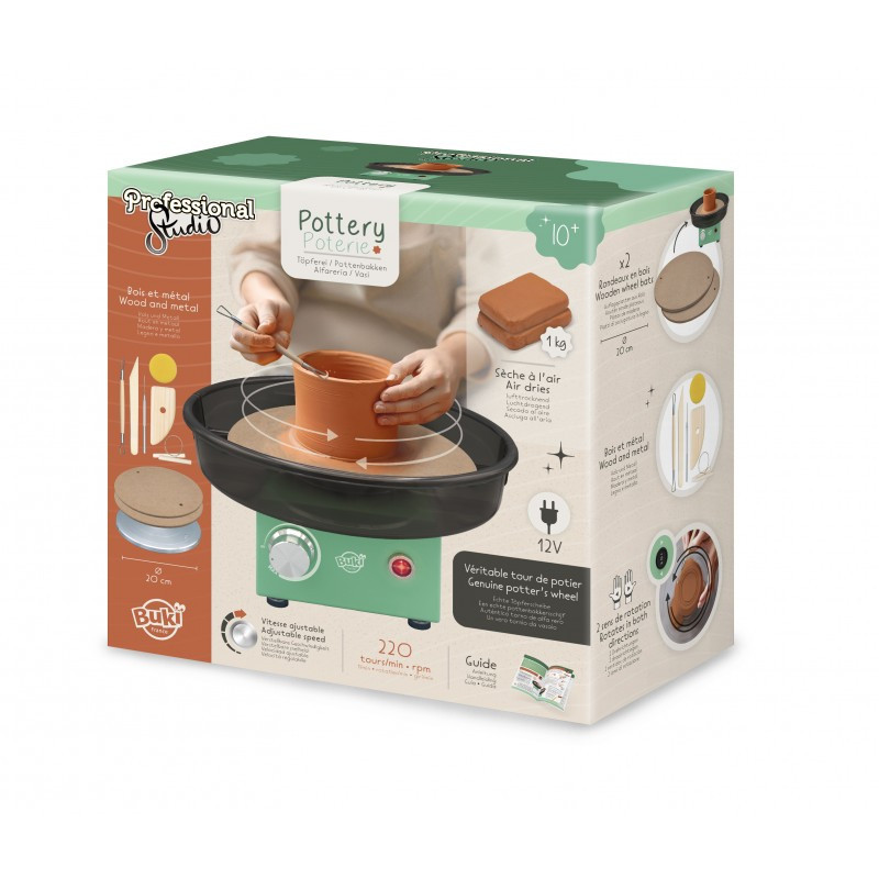 Igazi professzionális fazekas készlet, ami bemutatja a gyerekeknek és felnőtteknek a korongozási technikákat. A korong percenként 220 fordulatot tesz meg, így simán és pontosan lehet vele formázni. A 20 cm átmérőjű fém kerámia korongfej minden méretű alkotás elkészítésére alkalmas. Két kerámia alátét is található a csomagban, így az elkészült alkotásokat le lehet venni száradni, és közben újakat létrehozni. A korong mindkét irányba forog, így bal- és jobbkezesek egyaránt használhatják. A levehető fröccsenésgátló tálca megkönnyíti a tisztítást.