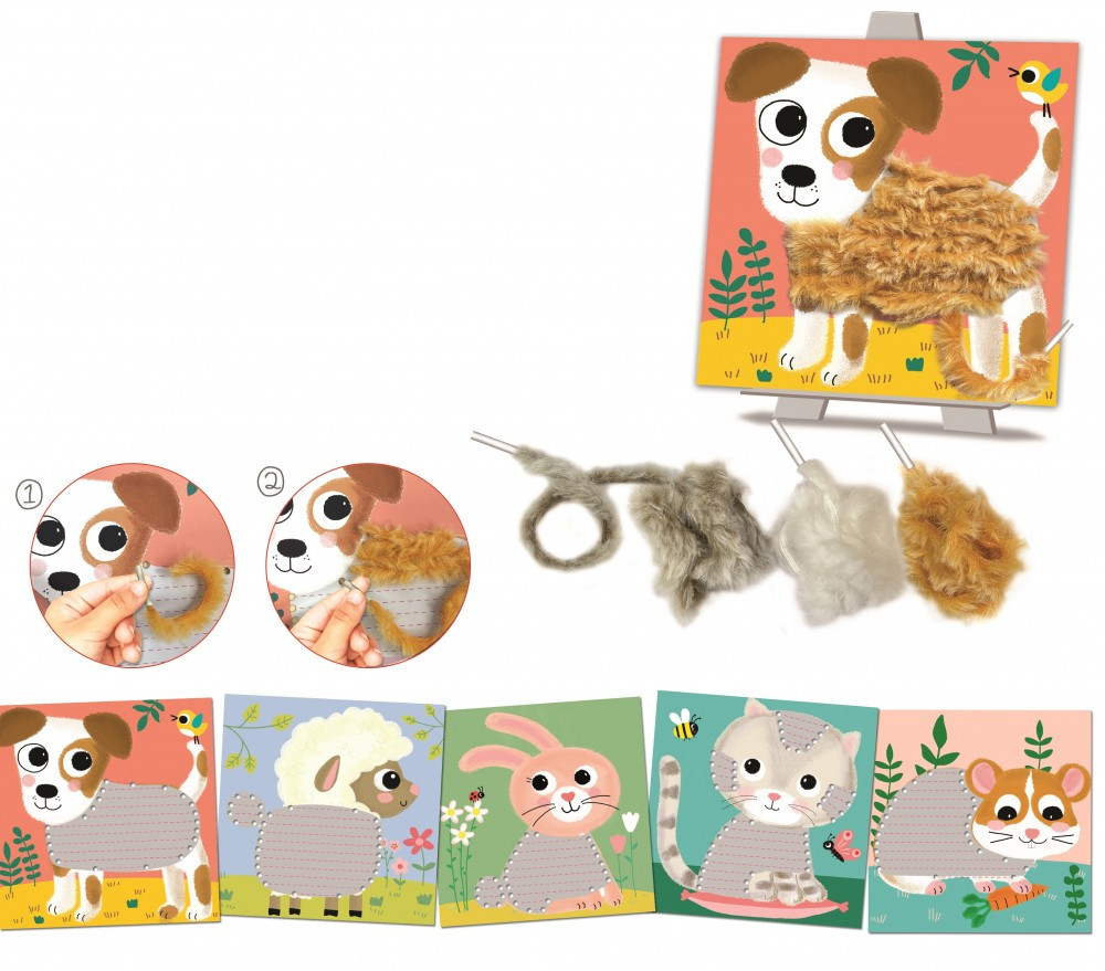A cipőfűző végű fonalakkal az állatoknak puha bundát készíthetsz! Fűzd őket végig az előre perforált képeken és az állatok megelevenednek! A játékot bármikor elölről kezdheted, hiszen a szálakat kihúzhatod és újra befűzheted, a színeket is cserélgetheted.