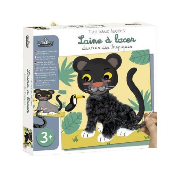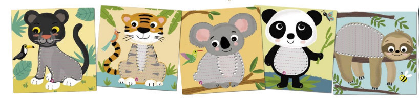 A cipőfűző végű fonalakkal a gyerekek puha bundát készíthetnek az állatos képeknek. Az előre perforált lapok segítenek a finommotorika fejlesztésében és az első, varrást vagy cipőfűzést imitáló mozdulatok megtanulásában. A játékot bármikor elölről lehet kezdeni, hiszen a szálak kihúzhatók, így a színek is cserélgethetők.