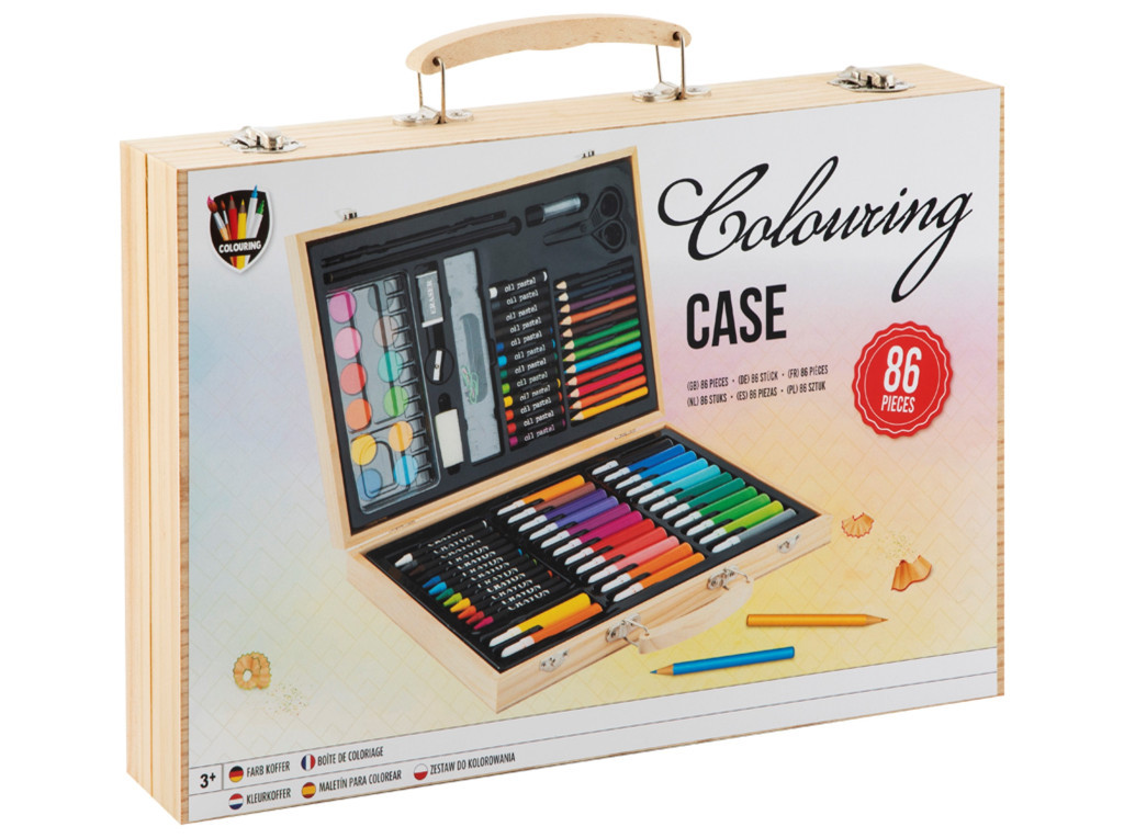 Fából készült bőrönd fogantyúval, a belsejében 86 részből álló rajzkészlet: filctollak, zsírkréták, festék, ceruzák és különböző kiegészítők, például olló, vonalzó és ceruzahegyező.