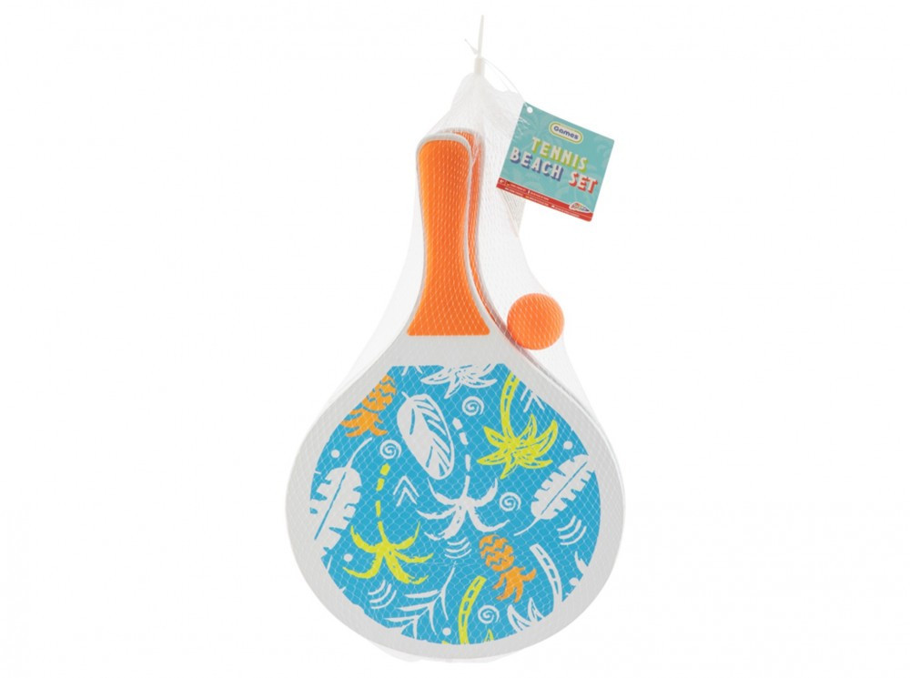 Fából készüld strandtenisz szett 2 ütővel és egy labdával, hálóba csomagolva.