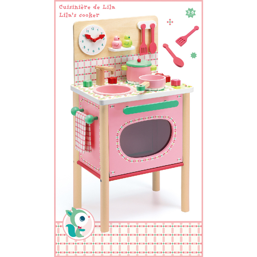 A nagyon szépen megmunkált fa tűzhelyen öröm lesz a kislánynak a sütés, főzés. A csinos konyhában a kezdő szakács rendelkezésére áll a sütő és a főző felület, kiegészítőknek: edény, serpenyő, keverő és kiszedő eszközök, konyharuha, só- és borstartó, óra stb. A kiskonyha része a mosogató is, keverő csappal. Figyelj, le ne forrázd a kis kezeidet! :)