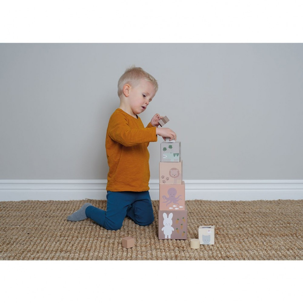 Öt egymásra rakható, természetes színekben pompázó kartonkocka, mindkét oldalán barátságos állatokkal és 1-5-ig terjedő számokkal.