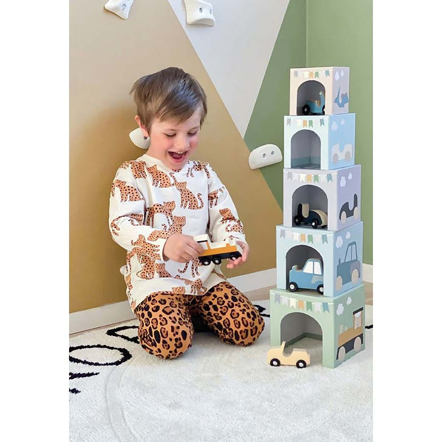 5 színes, egymásra rakható kocka 1-től 5-ig számozva, amely szórakoztató játékot nyújt a gyerekek számára. Minden egymásra rakható kockán két különböző motívum és egy szám található. A legnagyobb, 5-ös számú kocka körülbelül 15x15 cm. A játékkal egyszerű és szorakoztató módon lehet megtanulni a különböző járművek nevét és a számolás alapjait. A különböző kockákhoz aranyos járművek is tartoznak, amelyekkel akár külön is játszhat gyermeke. Minden kockába 1 különböző méretű járművet lehet elhelyzezni.