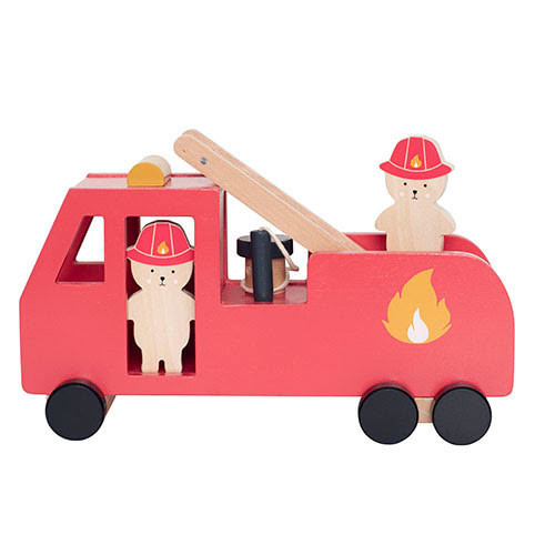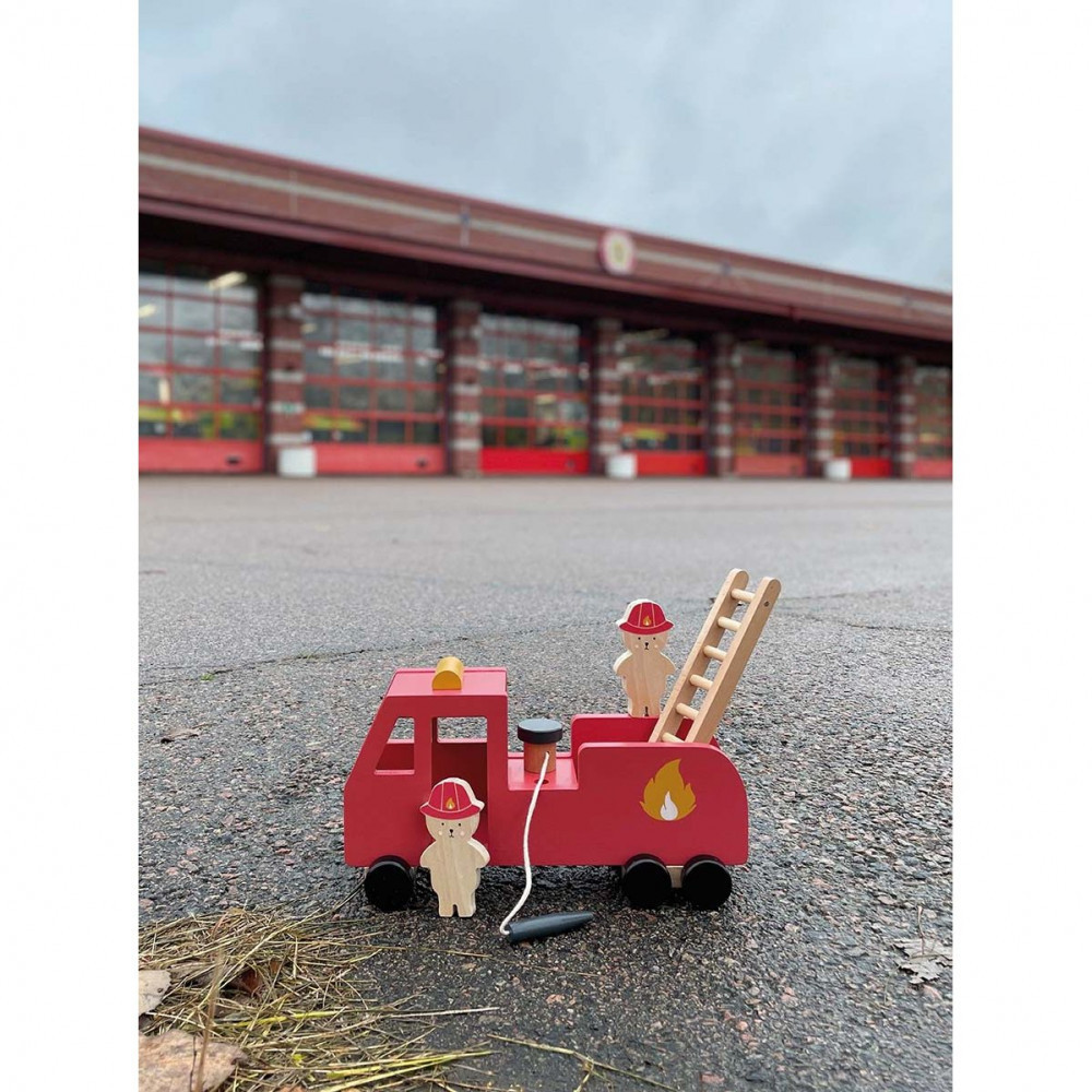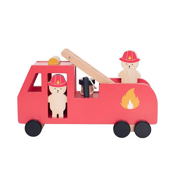 Fából készült színes tűzoltóautó a legkisebb gyerekek számára. Ezzel a menő tűzoltóautóval gyorsan ott lehetsz, ahol tűz ütött ki. A 2 kis maci tűzoltó a tömlővel felmászik a lépcsőn, és gondoskodik a tűz eloltásáról. A létra különböző irányokba fordítható és le is hajtható. A tűzoltó tömlőt felcsavarhatod, ha végeztél a játékkal.