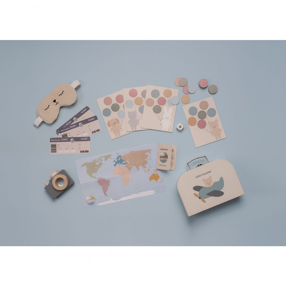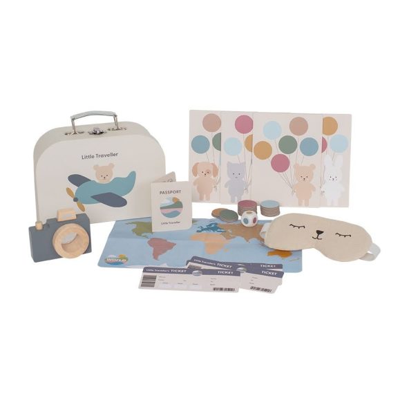 Játéktáskánk tartalmazza a legfontosabb dolgokat, amelyekre szükséged lehet az utazáshoz, legyen az akár hosszú vagy rövid. Kéznél lesz az útleveled, a jegyek és természetesen a saját fényképezőgéped is amely egy különleges prizmával lett ellátva, hogy még inkább rácsodálkozhass a nagyvilág szépségeire! Ha messzire utazol, egy szemfedőt is találsz a csomagban, amely segíti a pihentető alvást az út során. Továbbá egy térképet is találsz a bőröndben, így mindig tudhatod merre jársz, és ha unatkoznál, egy vicces lufis társasjáték is kéznél lesz, amit akár a barátaiddal együtt is játszhatsz! A játékhoz dobj a mellékelt kockával, és tedd a megfelelő színű lapkát az előtted lévő képen a megfelelő lufira. Aki először tölti meg a gyűjti ki a játéklapon található összes lufit, az nyer.