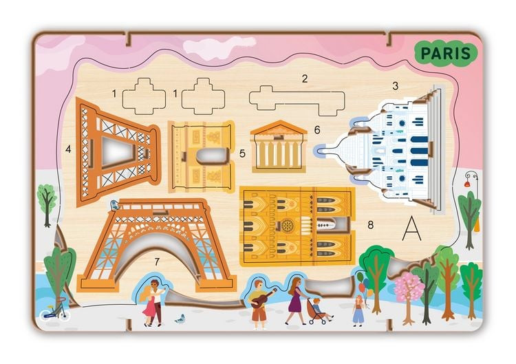 A híres épületeket bemutató képet a megfelelő fából készült elemek összeillesztésével hozhatod létre. Az elkészült kép remekül mutat majd a szoba dekorációjaként. Ez a szett Párizst ábrázolja.