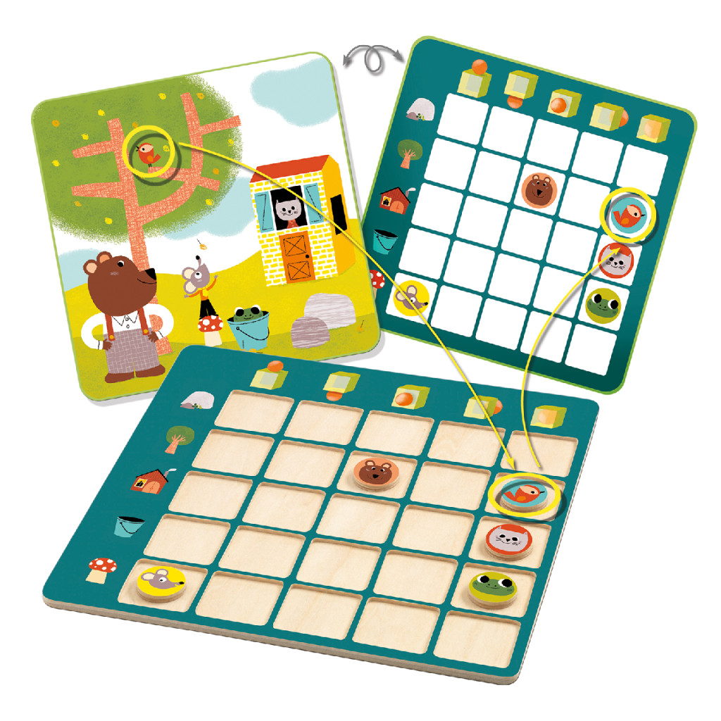 Hol van a béka? A házban. És a kismadár? Fent a sziklán. Szórakoztató és tanulságos feladatmegoldó játék, amely segíti a térbeli eligazodást és fejleszti a térlátást. A kérdések és válaszok kapcsán segít megérteni a fent, lent, előtt, mögött, alul, felül, jobb, bal fogalmakat.