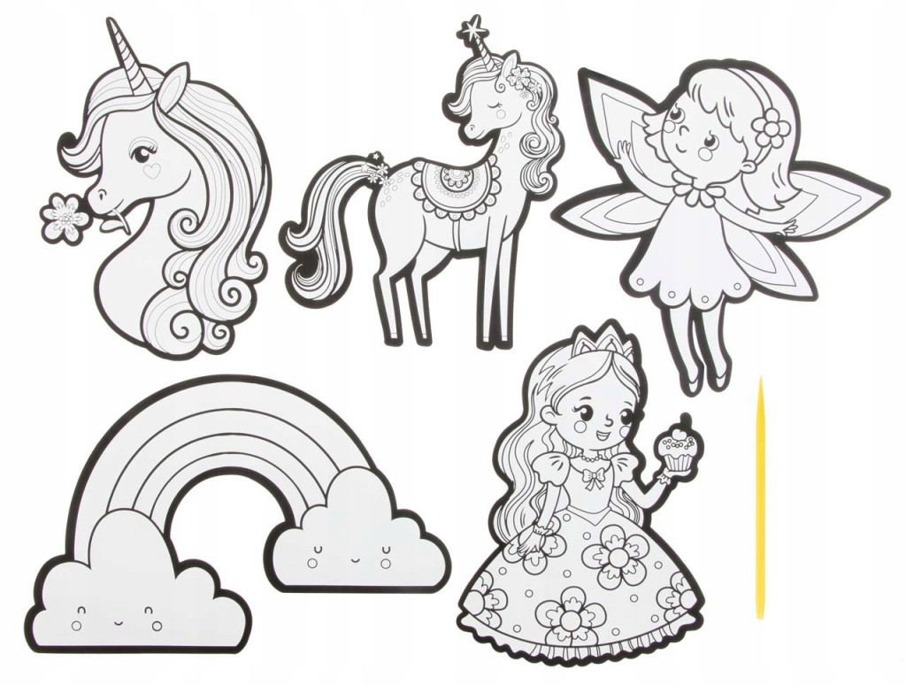 A készlet 5 darab 15 centiméteres matricát tartalmaz: 2 db egyszarvú, 1 hercegnő, 1 szivárvány és 1 tündér.