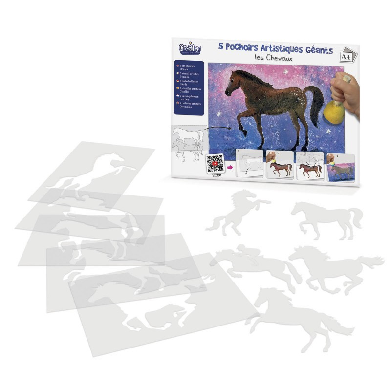5 db nagyméretű stencil sablon különlegesen szép lovas képek készítéséhez. A sablonok segítségével a gyerekek művészi képeket hozhatnak létre több fázison keresztül.