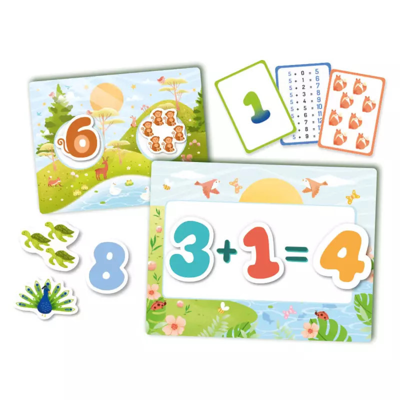 Szórakoztató mágneses doboz a legkisebbek számára a számok és állatok felfedezéséhez! A játék 1 kétoldalas mágneses háttér táblát tartalmaz, valamint 50 db mágneses állatot és számot. A 20 db mellékelt kártya lehetővé teszi a gyermekek számára, hogy megismerkedjenek a mennyiségekkel és az alapvető matematikai máveletekkel.