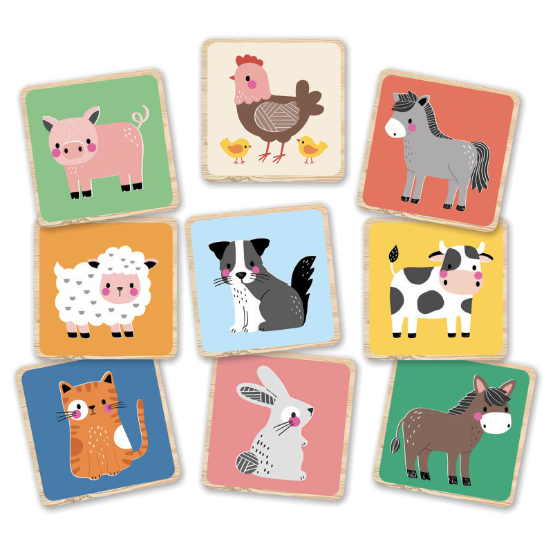 18 darabból álló memória játék (9 pár) a tanyasi állatok témakörében. Ez a játék segít a gyermekek játékos fejlődésében. Az elemek a kisebb kezek méretéhez lettek igazítva, így akár már 2+ éves kortól lehet velük játszani.
