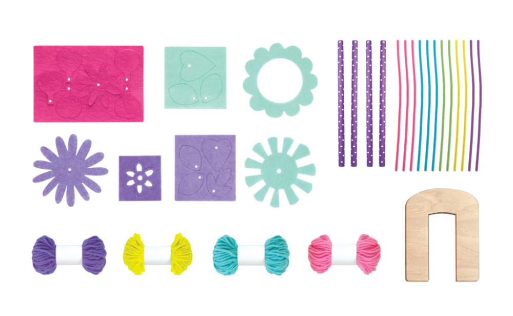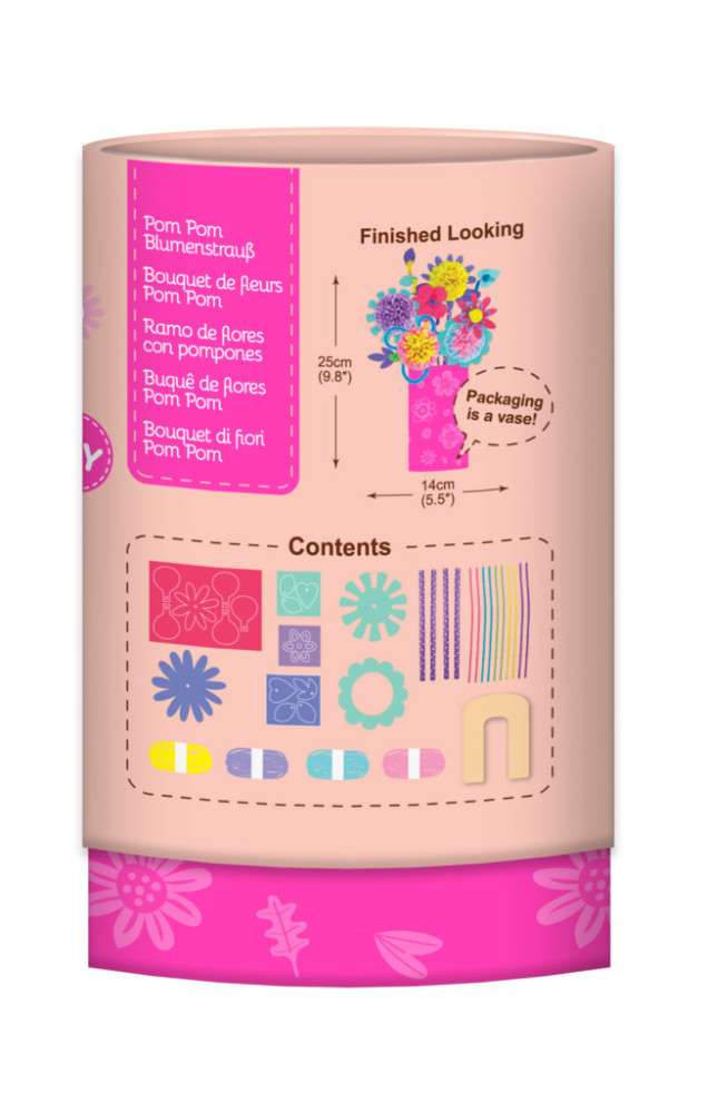 Az előre kivágott filcekformákkal és filcmatricákkal, az egyszerű, lépésről lépésre követhető utasítások alapján a gyerekek színes pom-pomokat készíthetnek, melyeket azután csokorba is köthetnek.