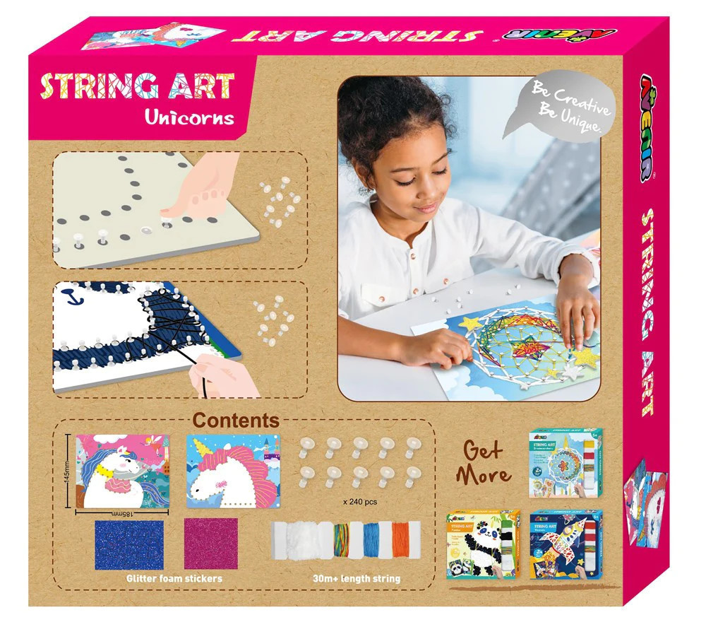 Készíts gyönyörű műalkotást ezzel az Avenir húros kézműves készlettel! Óvatosan tekerd be és tekerd fel a színes zsinórt a pöckök köré, majd díszítsd a mesés végereményért.