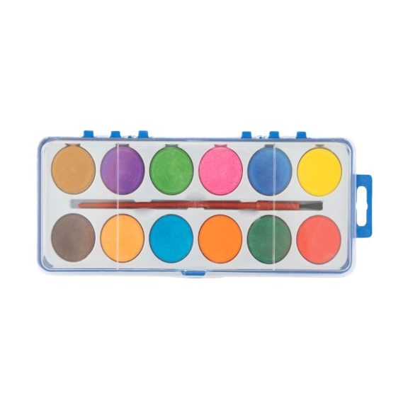 Vízfesték paletta 12 féle színnel és ecsettel, visszazárható műanyag fedéllel.